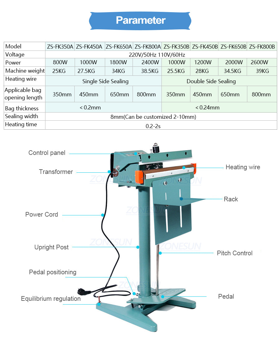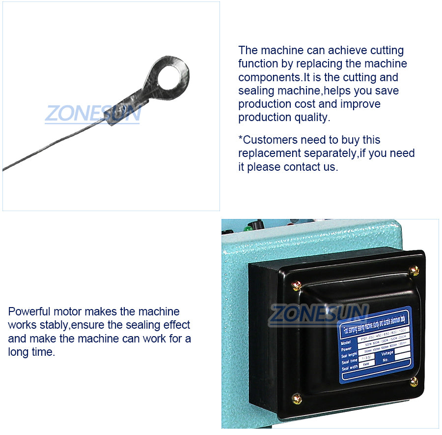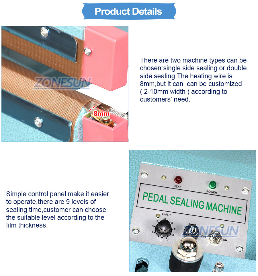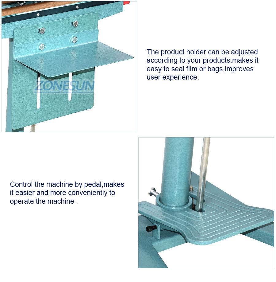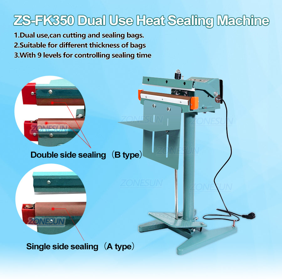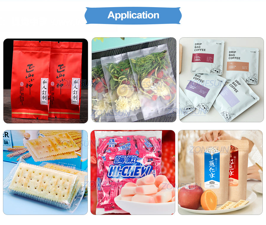 Ez a gép különféle táskák, például műanyag zacskók, alumínium fóliazsákok, kompozit fólia csomagolózsákok lezárására használható. Alkalmas folyamatos tömítőzsákokhoz az élelmiszeriparban, a teaiparban és a mezőgazdaságban.