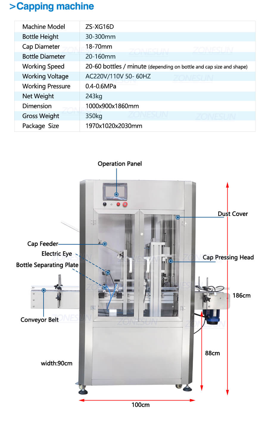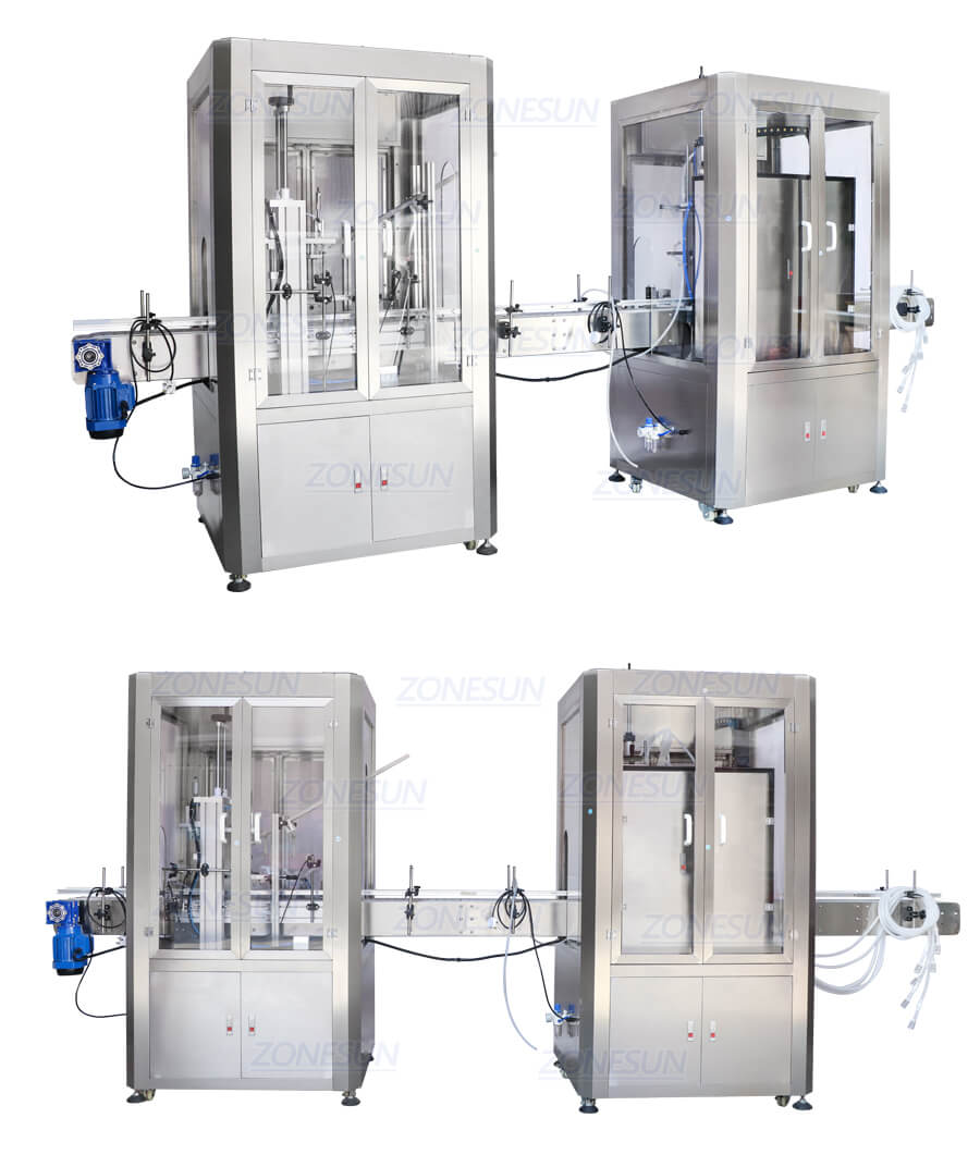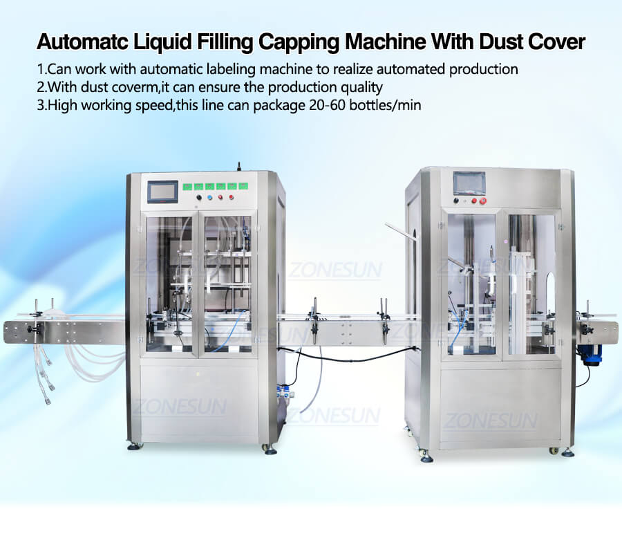 Baris produksi iki dilengkapi tutup bledug berkualitas, sing bisa nyegah saka polusi nalika kerja. Mesin Isi lan mesin Caping bisa disusun miturut ukuran puncak, lan ngisi rong mesin kasebut Bisa mlaku kanthi mesin labeling vertikal kanggo ngerteni produksi otomatis.