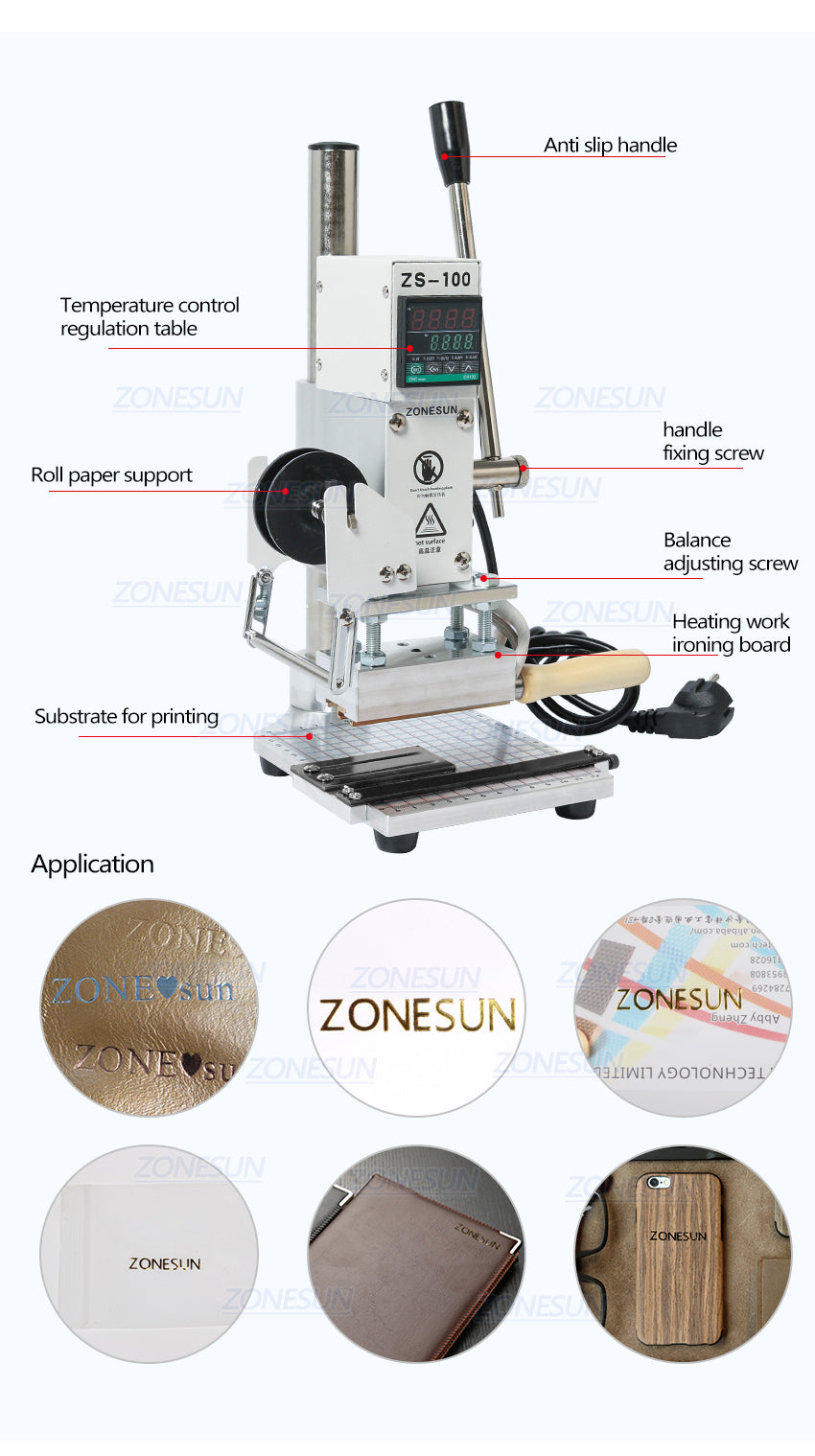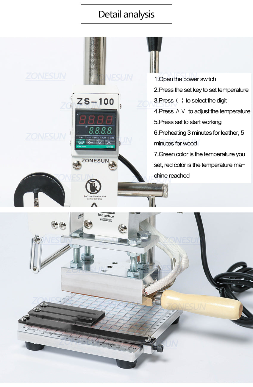 Zastosowanie: Służy do brązowania, wgłębienia i brandingu Produkty skórzane, produkty gumowe, produkty techniczne, produkty z tworzywa sztucznego, papier i inne powierzchnie.