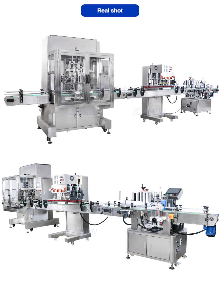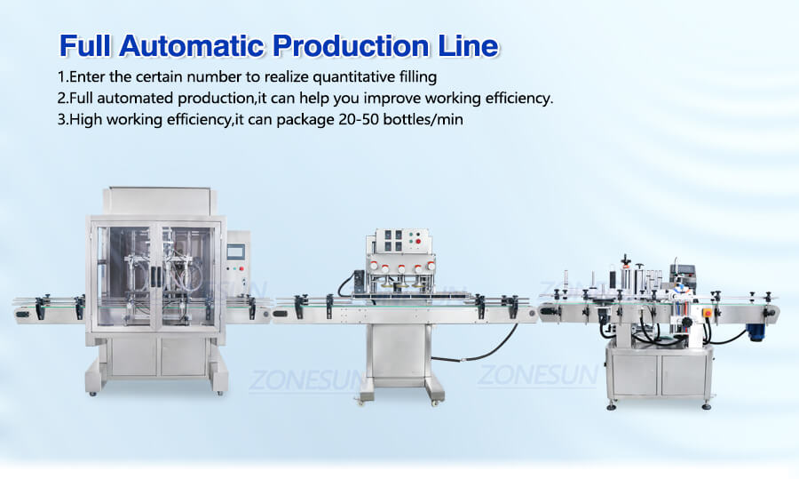 This production line can fill liquid,cap bottle lids and label stickers automatically,it is the ideal choice for producing drinks,cosmetics products or skin care products.The automated production can help you to reduce production cost and error,improve working efficiency and production quality.