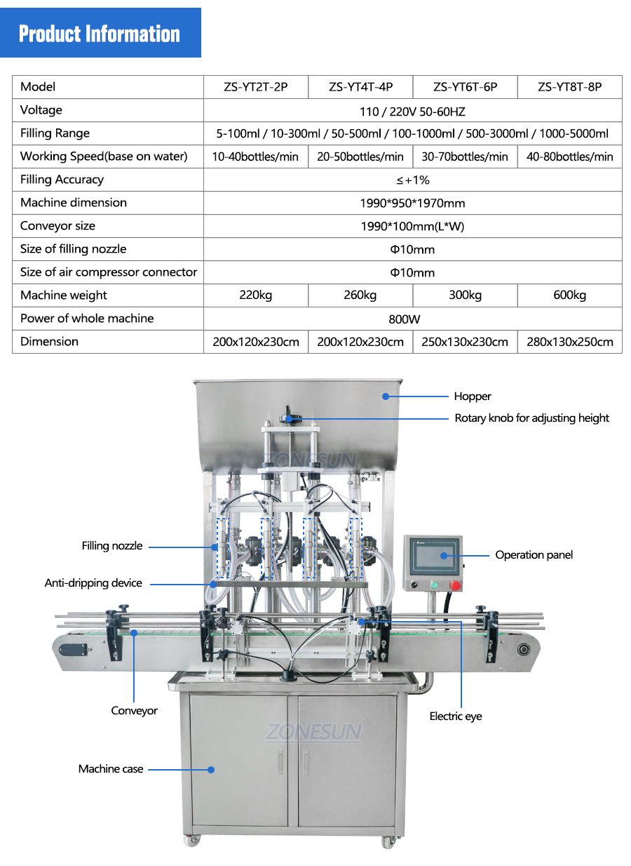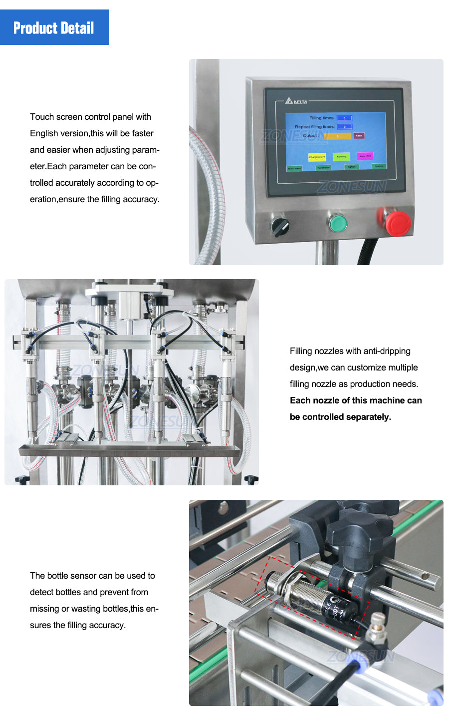 This filling machine is in larger filling flow rate,can be used to fill liquid and paste.We can offer multiple nozzles of filling machine as customers’ need like 2/4/6/8 nozzles.The custom-designed liquid filling machine can give your facility the solution it needs to help boost productivity and minimize breakdowns
