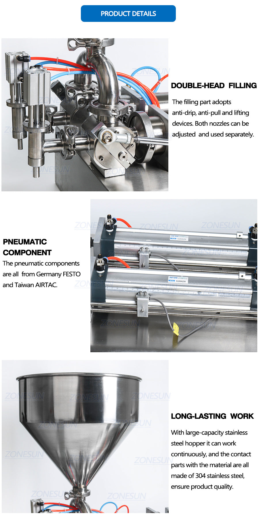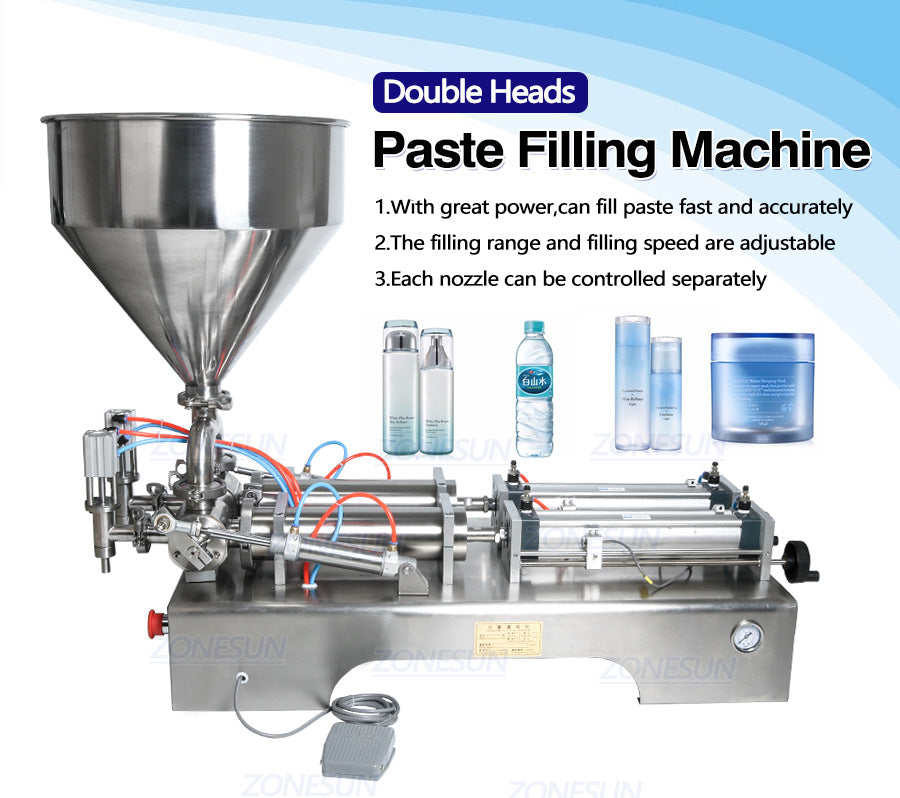 This paste filling machine is suitable for thick liquid like shampoo.honey,curry paste,tomato paste,lotion etc.The filling range and filling speed can be adjusted according to production need.There are two nozzles,each nozzle can be controlled separately.